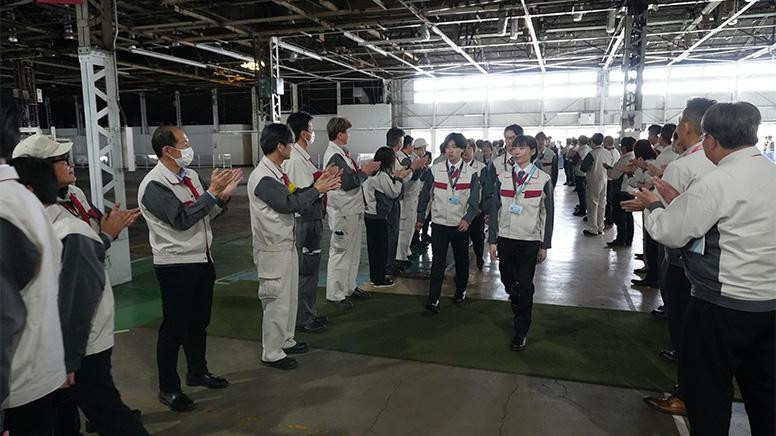 Mr. Shirai: Furthermore, on the day of the initiation ceremony, senior employees welcomed everyone with high-fives on the route from the main hall of the Head Office, where the ceremony was held, to Ikeda Plant No. 2, where the vehicles were displayed. Despite the hasty announcement, more than 150 people gathered! They were overflowing with the desire to welcome the new “Partners” who had just joined Daihatsu.