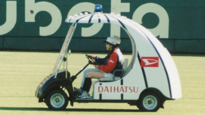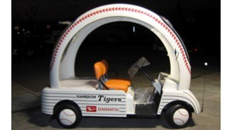 Since the official games in 1999, the relief car produced based on the EV golf cart had been used, featuring the Tigers’ signature black and white stripes with the “DAIHATSU” logo. The design was inspired by a helmet! Apparently the purpose was to protect the pitcher even if something came flying from the stands! There were two different colors, one for the Tigers and one for the other team.