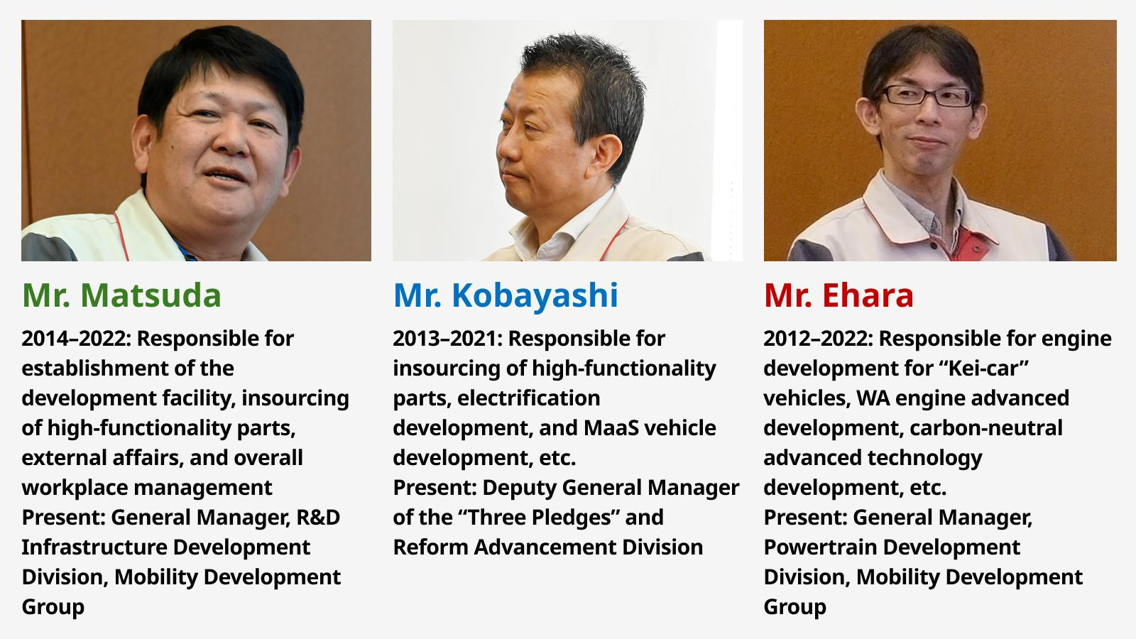 Mr. Ehara I believe it’s better for the area of advanced development to maintain a certain “physical distance” from mass production development. If their locations are too close, short-sighted opinions that confuse their respective purposes tend to creep in. Conversely, if they’re too far apart, communication gaps emerge, often leading to different problems. In that sense, Osaka and Kyushu might be just the right distance apart. Furthermore, the understanding of managers who encourage and oversee challenges in both advanced development and mass production development is crucial.