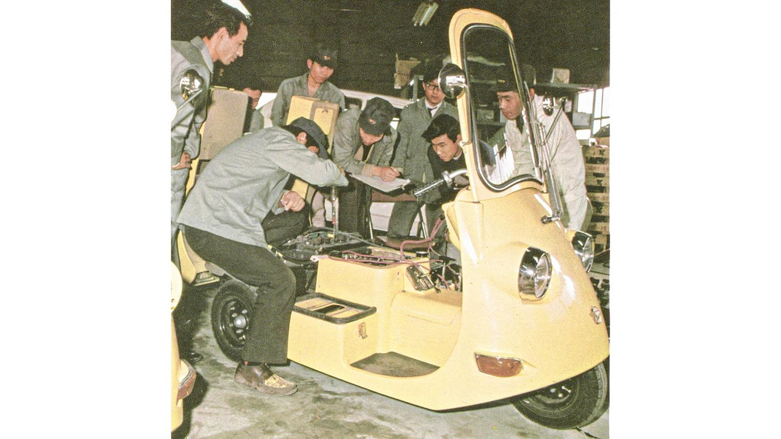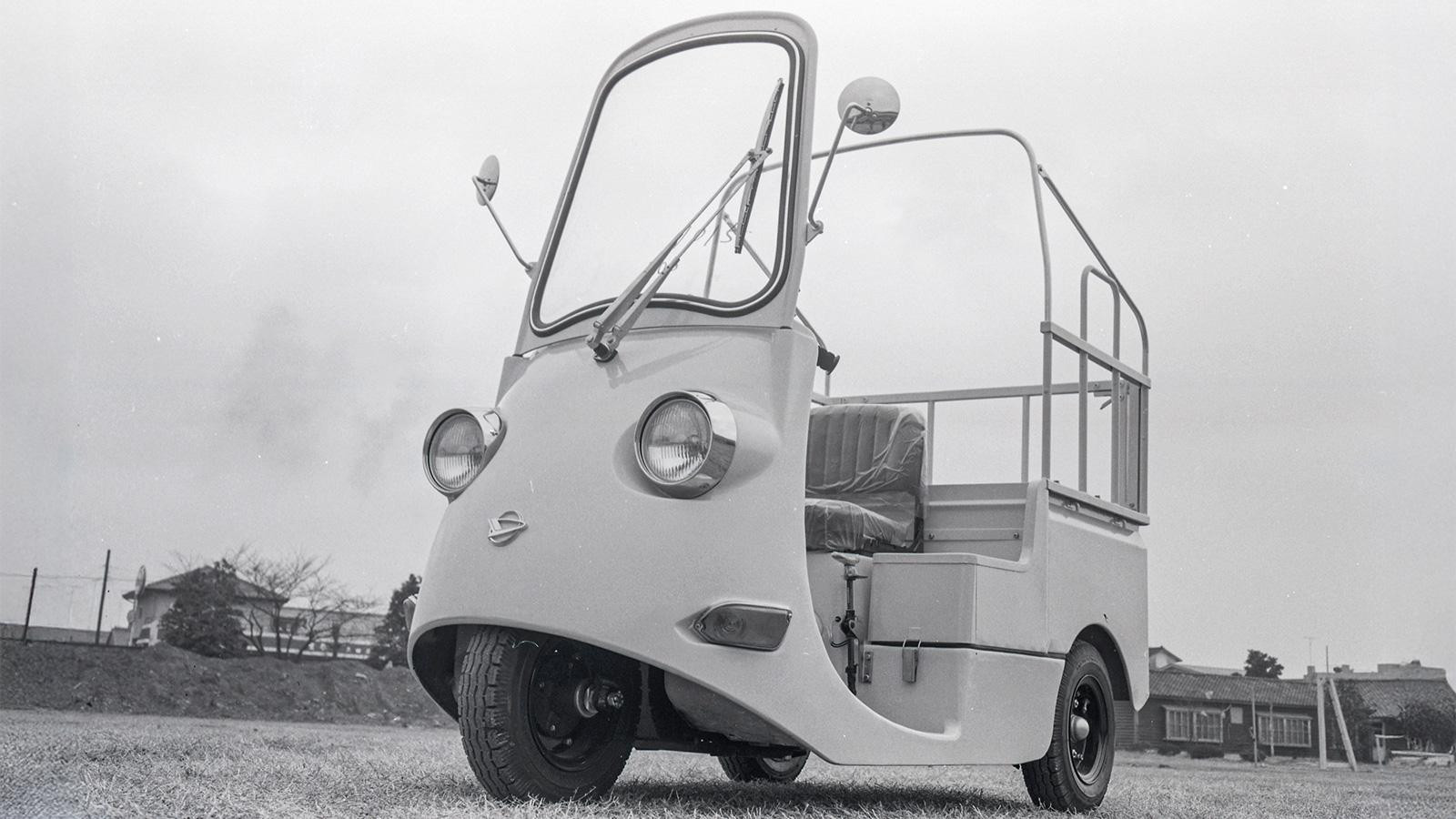 ところで「DBC」とは? D:DAIHATSU、B:BATTERY、C:CARと、DELIVERYのDの意味も併せ持ったそれぞれの頭文字から命名。その名の通り集配用EVで、公害対策の必要性が叫ばれとった当時、排ガスゼロ、静かやから住宅街の朝刊配達にはぴったんこや。