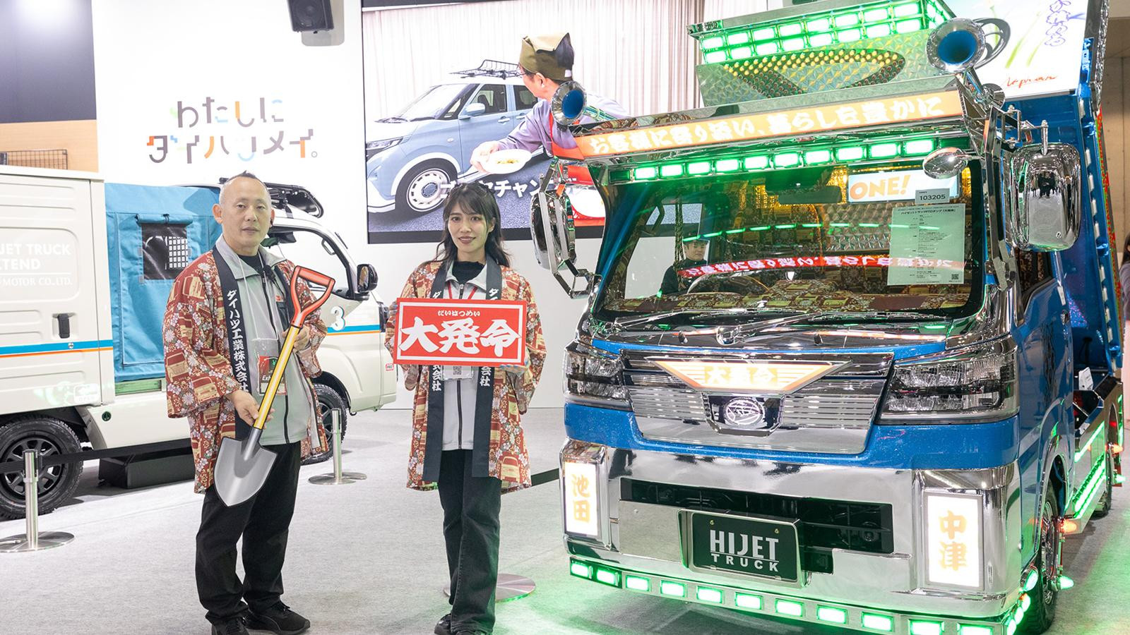 多くの方に元気を届けたい想いで、今回TASの企画・制作を担当しました。PTOダンプをベースに、スローガン入りのバイザーや歴代ハイゼット柄の内装、輪投げになる荷台など、ダイハツの想いと歴史を表現しています!